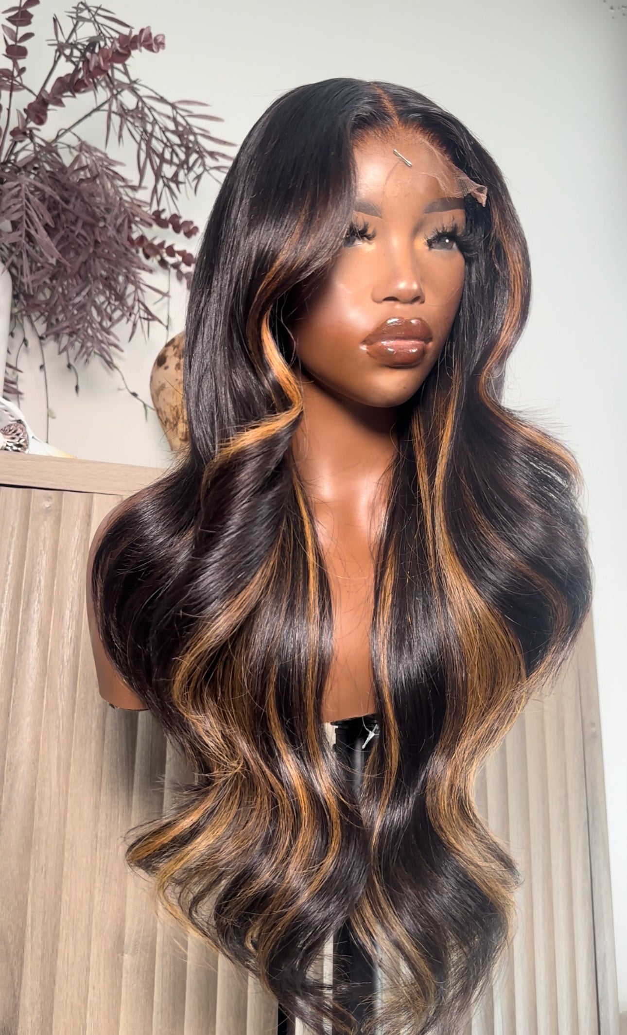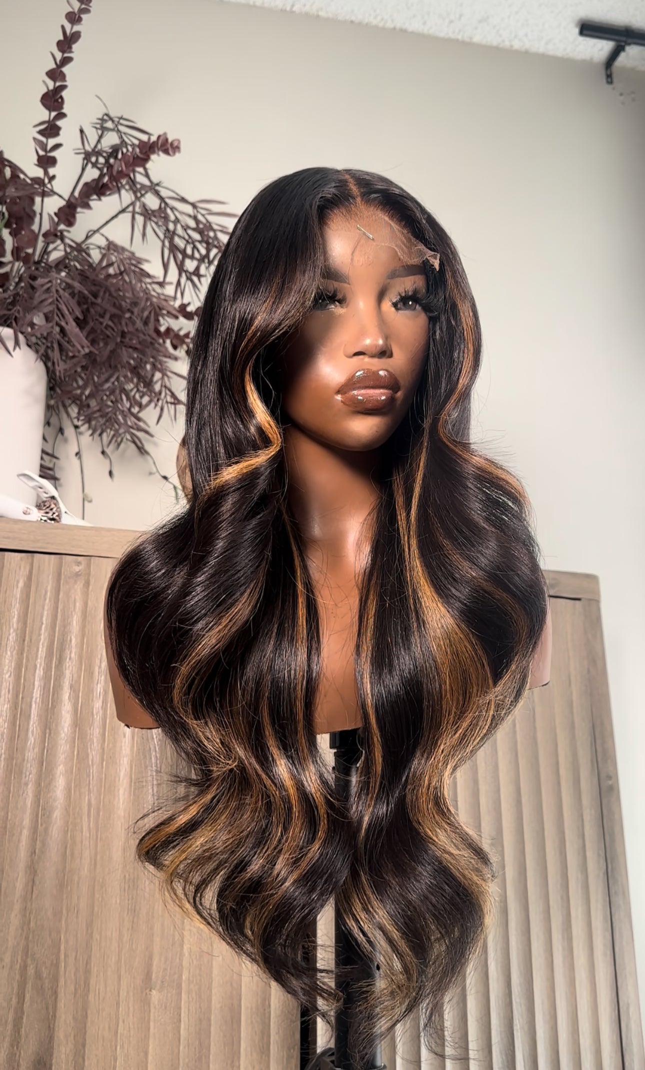22 inches, 5x5 HD lace closure, glueless, wig. NO GLUE needed. Wigs last up to 3-5 years. She is constructed with our Raw Vietnamese wavy hair. Customized with bleached knots, wig band and comb for security. Glue application not required